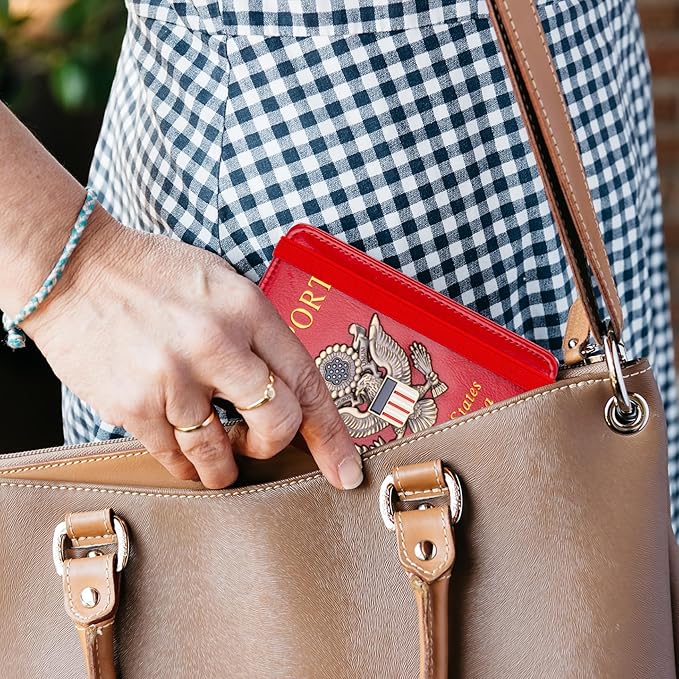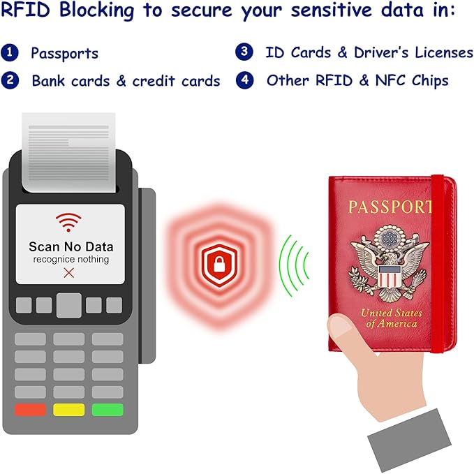 - RFID Security: The leather passport holder rfid blocking has a special material to block RFID signals so that the passport organizer can protect your personal information in your passport and credit cards from unauthorized scans. RFID blocking shielding material of the passport holder men women is used to prevent thieves from swiping your credit card to steal your personal information in airports or crowded places.