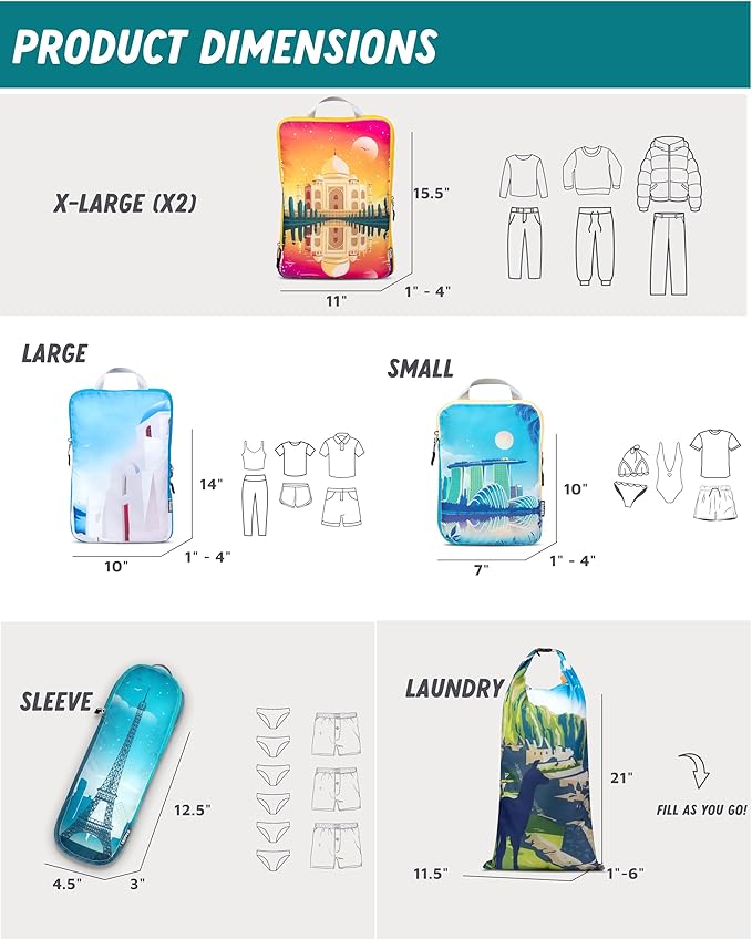 - USE EXPANDED OR COMPRESSED- Use these like normal packing cubes when you need to pack more. Packing less? Use the compression zipper to save even more space! Extra Large Dimensions Compressed size: 15.7x11x4in Large Dimensions Compressed size: 14x10x1in Expanded Size: 14x10x4in Small Dimensions Compressed size 10x7x1in Expanded Size: 10x7x4in