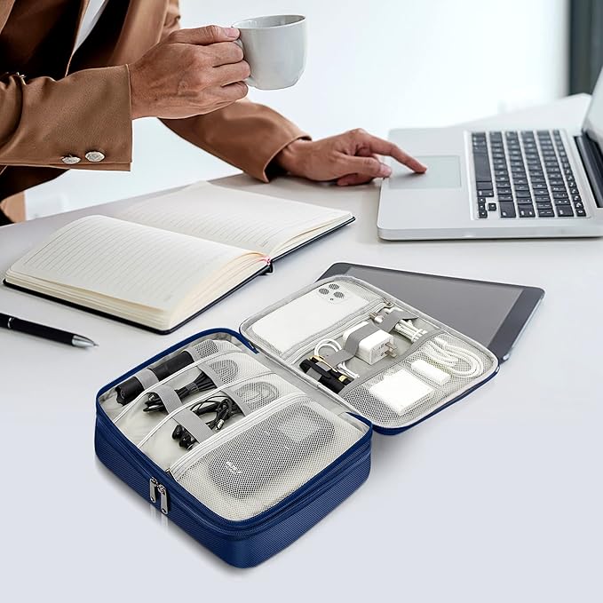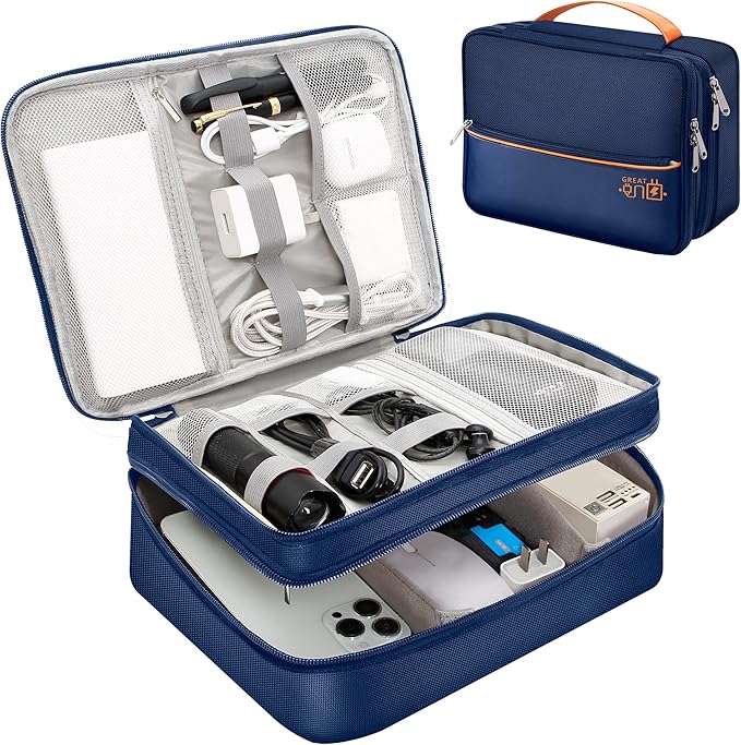 - DOUBLE LAYERS: The electronics bag is designed with 2 Layers interior compartment, the upper compartment can be used to organize Cable, Charger, Cellphone, Flash Drive, Earbuds, the lower compartment can store Adapter, Hard Drive, Power Bank, Tablet Computer. The front pocket provide a easier way to store your Cable, Cellphone or Power Bank.