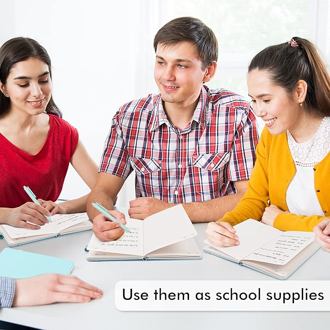 - Feela 12 Pack Classic Ruled Notebooks contains 12 sky blue ruled sturdy cover notebooks and 12 Black Retractable Pens. Each of the notebooks measures 8.3” x 5.1”, which is perfect to carry and easily held by young girls and boys. These black cute pens are customized to be placed in the pen holder, which is pretty convenient.