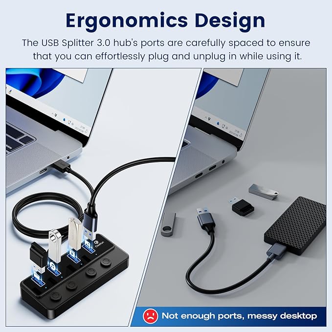 - Individual Switcher with LED Indicators: Blue LED of this usb hub adapter hub shows working status for each port, Individual switch turns off port whenever you donβt need it. Avoid hot-swapping and environmentally friendly, low power consumption to prolong the lifespan of devices