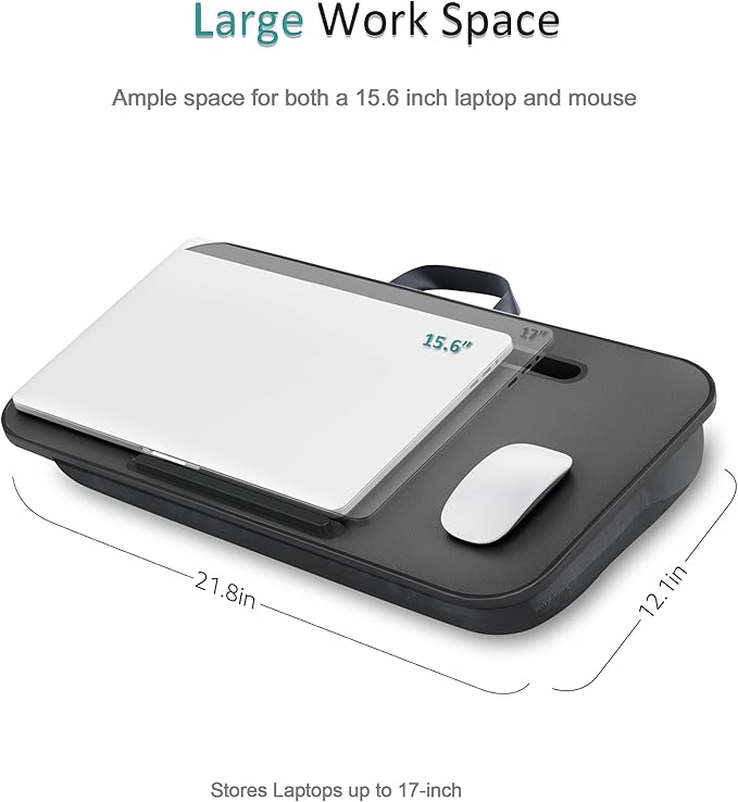 - 2. [Large Workspace]: The desktop of the laptop desk measures 21.8 inches wide and 12.1 inches deep. It can fit laptops up to 17 inches. There is enough surface space for a mouse only when used with laptops that are 15.6" in size or smaller.