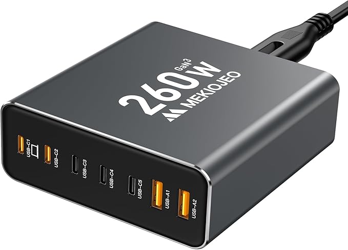 - 7-in-1 USB C Charger: This usb c charger block provides 7 charging wattage options with 5 USB-C ports and 2 USB-A ports. Such a usb c multiport charger can handle all your devices at fast speed with a total output up to 260W. What's cool is that you can charge two laptops with our top two usb c ports of 65w.