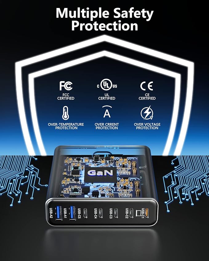 - 7 MultiProtect Safety Systems: Our 260w usb c charger block is equipped with enhanced surge protector: Temperature Protection, Over-Current, Over-voltage, Overcharge, Overload, Overheat and Short circuit. The certification authority of our usb-c charger is in line with safety certifications, ensuring 100% for you and your device's protection.