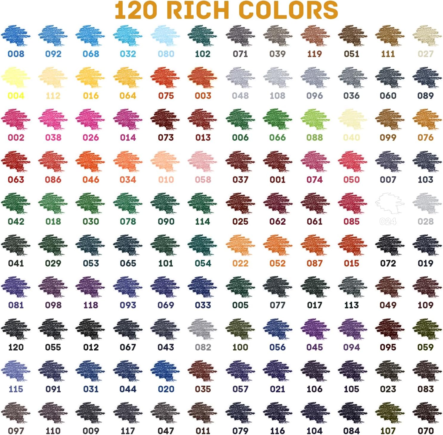 - VIBRANT & RICH COLORS : 120 oil-based coloring pencils set, each colored pencil has its own unique color number, easy to identify and use. The thick lead of a pre-sharpened art pencil that blends perfectly and effortlessly colorizes and layers