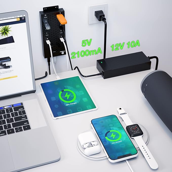 - QUALITY USB C HUB - The black Metal Housing of the Desktop Charging Station is made of study High-Quality Aluminum Alloy. USB C Adapter Hub has a special built-in Power Adapter with 12V/10A/120W Power Supply & Cooling Fan triggered by a built-in Temperature Sensor when the Internal Components are heated up to 122-131°F. USB Port Hub has strong built-in multi-level Protections: Over-Voltage, Over-Current, Short Circuit, Over-Heating, and Lighting Protection.
