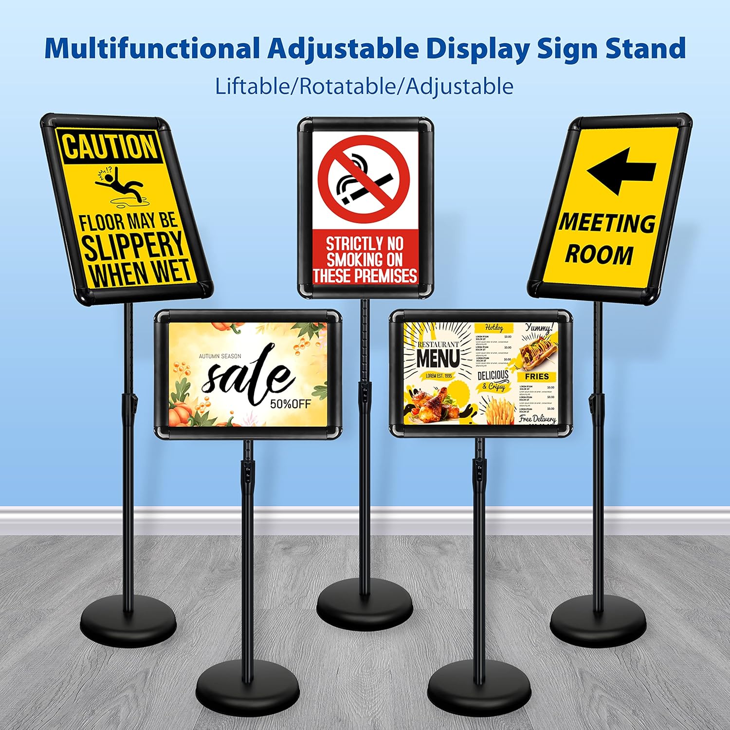 - ✔Widely Used: Sign Stand is suitable for trade exhibition, foyer, reception area, restaurant, Retail Store, office, hotel, hospital, school, bank and other public event places to display poster sign information. stands up well on hard surfaces, both suits for Indoor and outdoor.