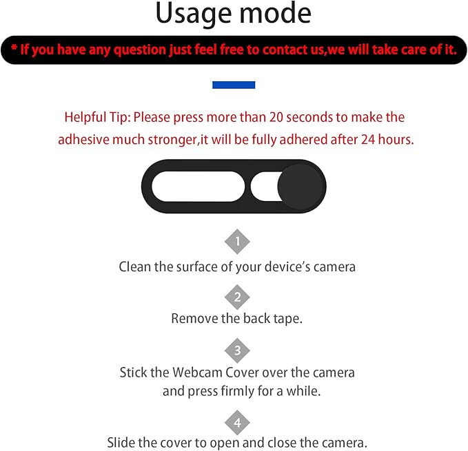 - [Easy to install] No complex operation, just remove the back tape and align the camera, stick the product over it and press firmly for more than 20 seconds. The webcam cover can be slid to protect the user using.This camera cover can protect your privacy by one finger movement. Made of high quality plastic material, lightweight but durable. Strong back adhesive not easy to fall off.