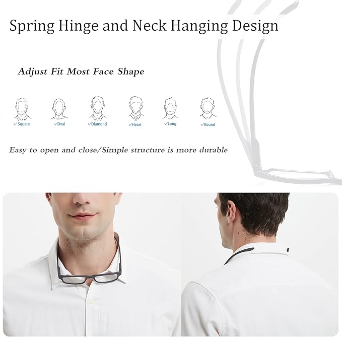 • 👓【Neck Hanging Practical design】Neck hanging reading glasses with neck hanging practical design,Forgetting is a very common inconvenience。But you will not have to worry about that.The reading glasses have long curving arms that hang around your neck and your glasses are within reach when you need them.