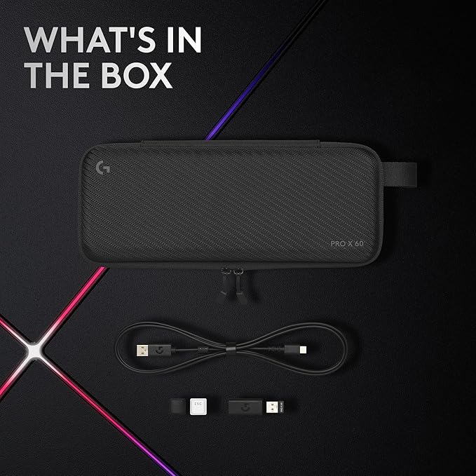 - Contents: PRO X 60 Wireless Gaming Keyboard, USB LIGHTSPEED wireless adapter, USB-A to USB-C charging and data cable (6 ft./1.8 m), Logitech G keycap, carrying case and user documentation