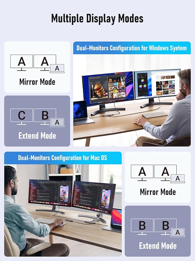 - [4K Dual Screen Display Hub] This ultra-thin USB C dual HDMI adapter supports mirrored or extended modes and provides crystal-clear 3D visuals and high-quality video experiences through its 2 HDMI ports. In Windows systems, dual HDMI ports can achieve three-screen displays in A-B-C mode, while in macOS systems, they can only achieve dual-screen displays in A-B-B mode. It can help you display different pages on two monitors, allowing for special applications such as comparing table data, images.