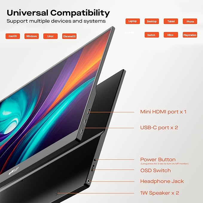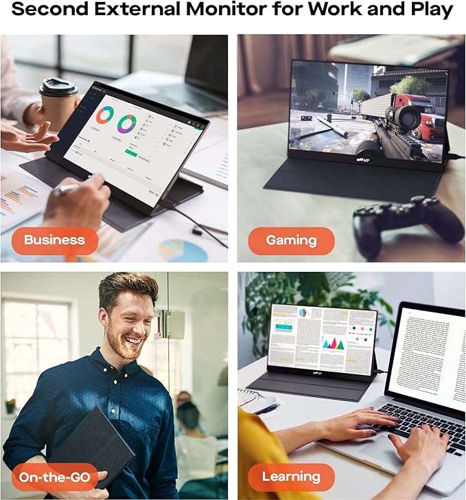 - Second External Monitor for Work and Play: This portable monitor serves as a second screen to your laptop, you can keep multiple applications open side by side, have more space for editing documents or photos, and easily switch between tasks