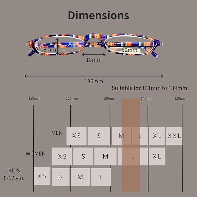 - READING GLASSES- Exclusively Crafted by MIYUI JAPAN, these glasses showcase a contemporary design and expert craftsmanship. Frame dimensions are: Width 135 mm (5.31 inches), Height 18 mm (0.7 inches), Eye Size 50 mm (1.96 inches), Nose Bridge 18 mm (0.7 inches), and Temple Length 135 mm (5.31 inches).