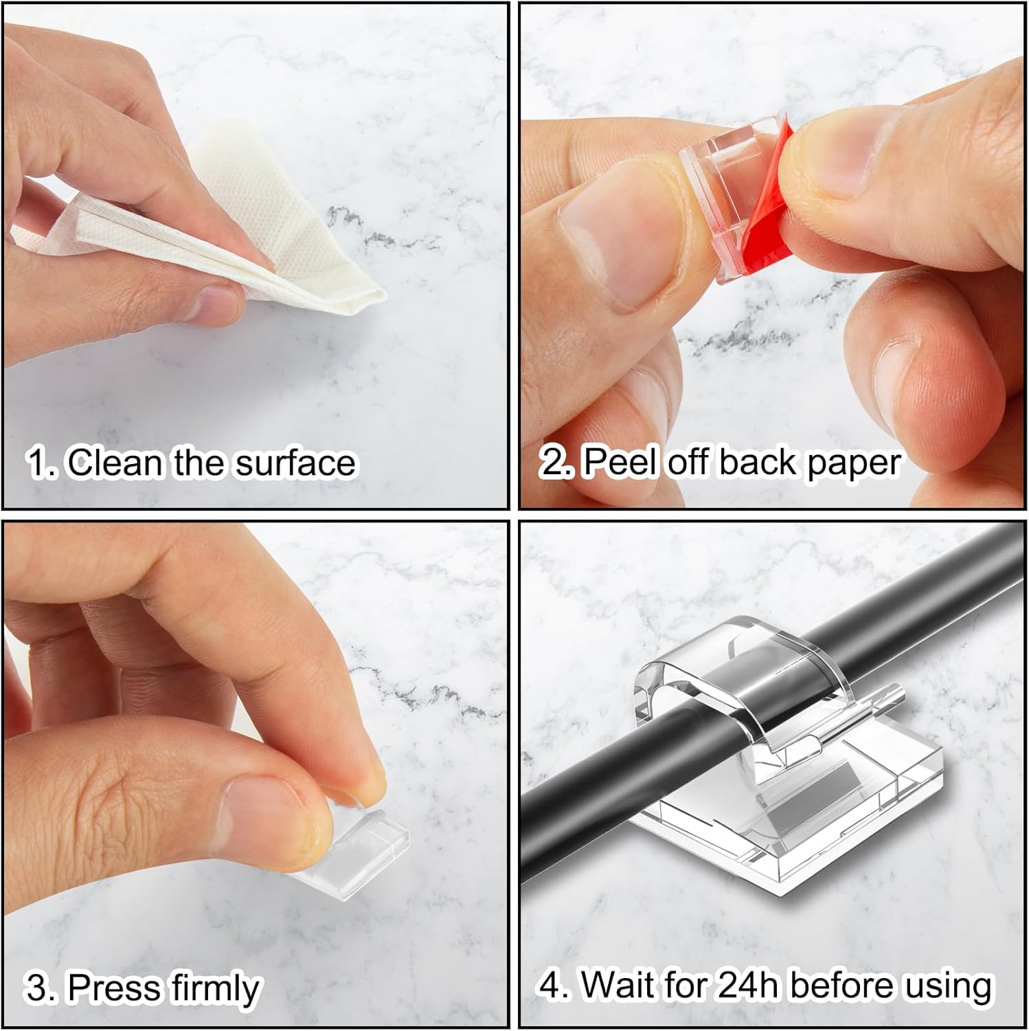 - Self-Adhesive Clips: Sticky cable holder clip with self adhesive pad can grip the surfaces stably which can be removed easily without damage to the desktop and with no residue leaving on the surfaces.