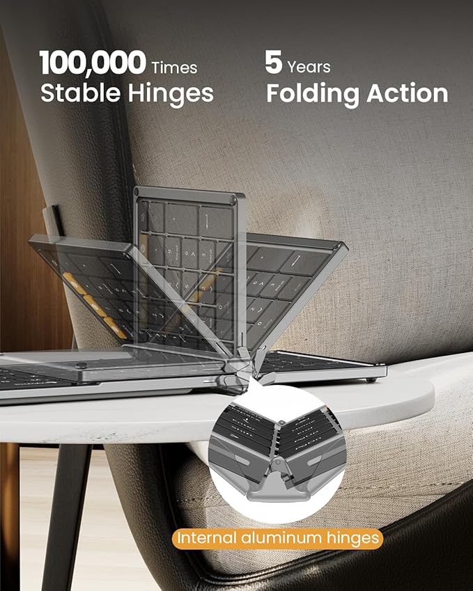- Full-Size Productivity On The Go: A 105-key folding keyboard delivers a true desktop experience with dedicated function/number pads—ideal for spreadsheets, coding, or data entry anywhere. Designed for frequent travelers, its ultra-slim profile and flat typing surface (no tilt) enable effortless portability, while the simple fold-and-go mechanism (no locking clips) ensures quick deployment