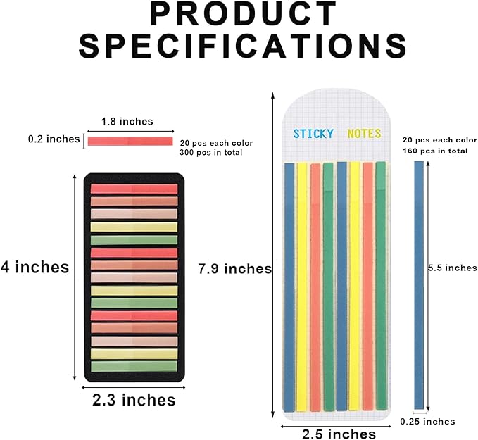 - 【2300Pcs Highlighter Tape】:Potanro strips sticky tabs set have 2300 pieces sticky notes tabs in total, these tabs can help you to highlight and mark pages, instead of marking with highlighters which make permanent marks on book and damage your book.