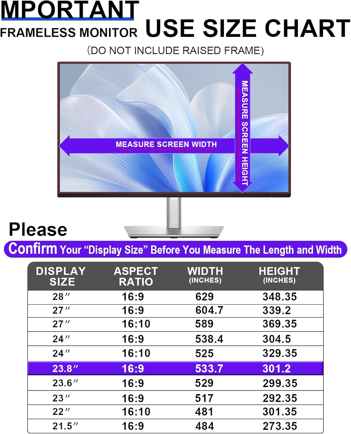 - ă2Pack-23.8 inch COPUTER PRIVACY SCREEN 16:9ăFILMEXT 2 Pack 23.8 Inch Removable Computer Privacy Screen Filter for 16:9 Frameless Monitor/Micro Thin Bezel/Narrow Border Monitor/All-in-One Desptop (not include curved Monitor ) - Width: 21.01" (533.7 mm), Height: 11.86" (301.2 mm), 23.8 inch 16:9 FILMEXT Privacy Screen Filter is engineered to be ideally compatible with Sceptre, Acer, HP, Dell, ASUS, LG, SAMSUNG, Lenovo, ViewSonic, BenQ, Philips and other monitor brands.