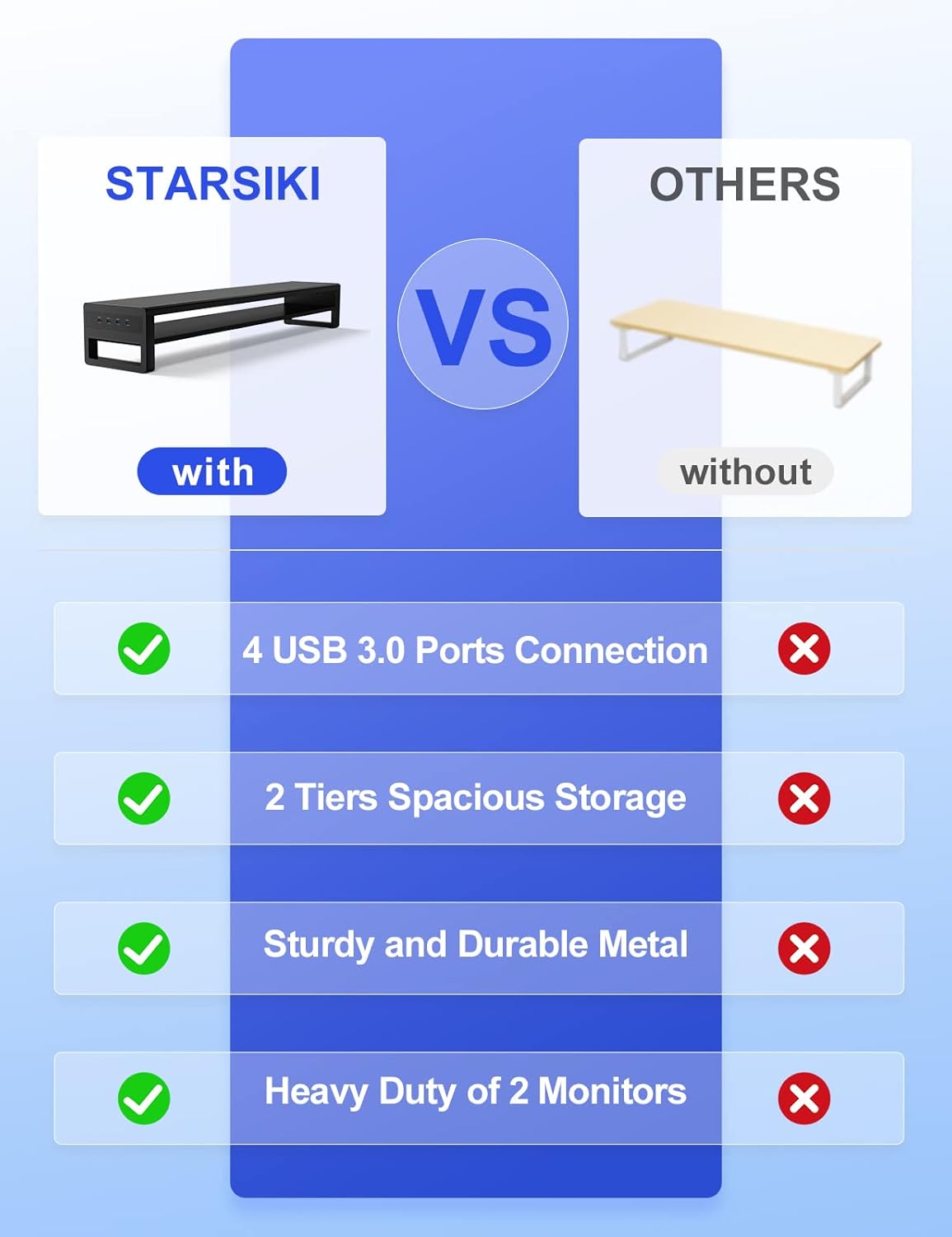 - 【2 Tiers Storage Space Saver】Featured 2 tiers storage design, the double monitor riser adds extra space for your desktop. It’s super handy for you to store keyboard, mouse, tablet, hard driver, notebook and more beneath your monitor within easy reach. The computer monitor stand keeps your desk clean and organized. Say "Goodbye" to the clutter desktop.