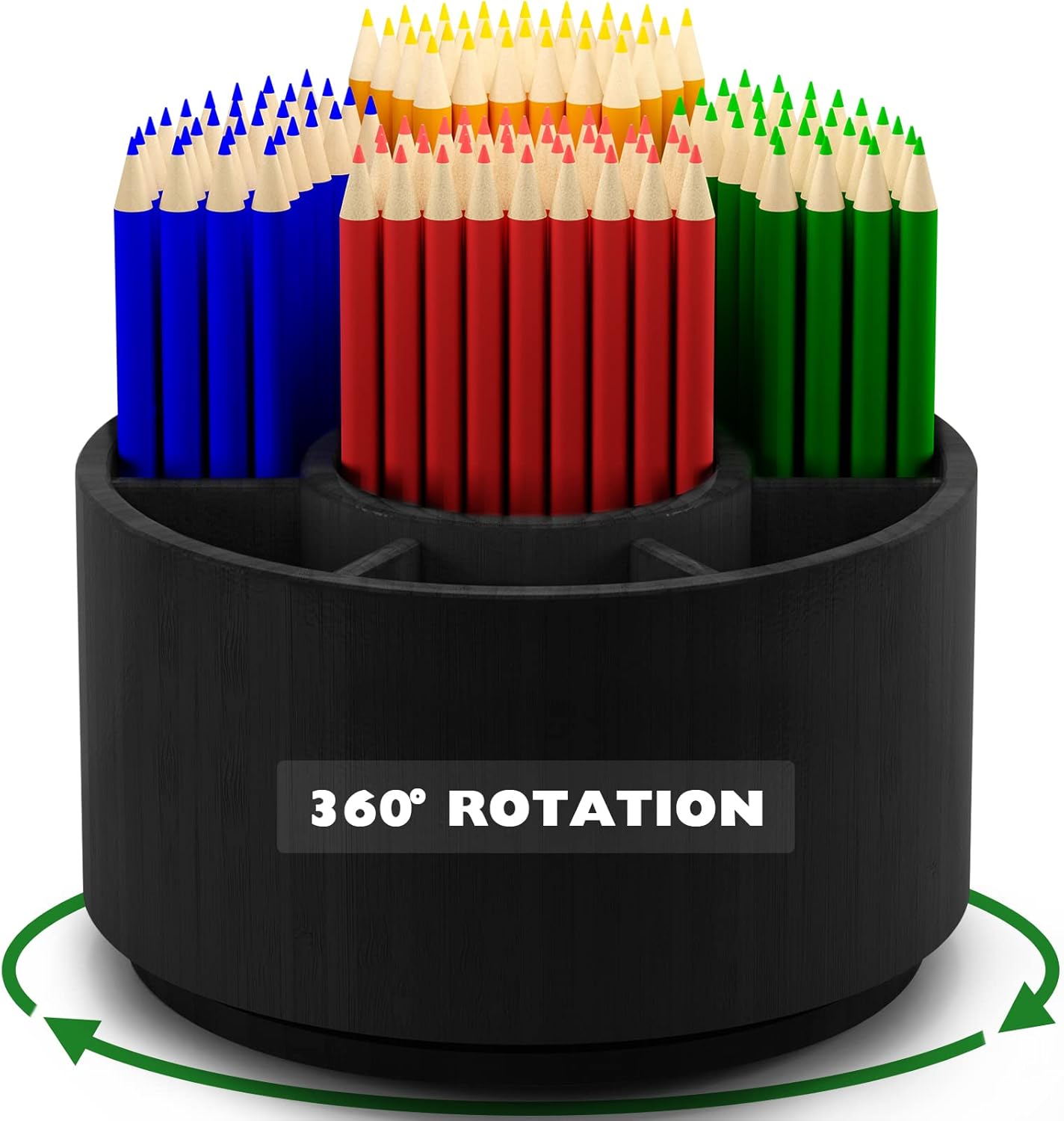 Bamboo Rotating Pencil Holder for Desk - Pen Holder Desk Organizer with 7 Compartments, Black Office Supplies Desktop Storage Caddy for Colored Pencils, Markers, Crayon, Comestics and Cutlery