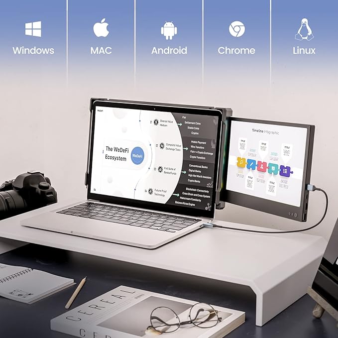 - Plug and Play--Easily set up the portable monitor for laptop and begin working from the comfort of your own home or office. This monitor extender is compatible with MAC, Windows, Android, Chrome, Linux, Switch, Xbox, and PS4. Simply plug and play. Ideal for designers, IT professionals, stock analysts, and more!