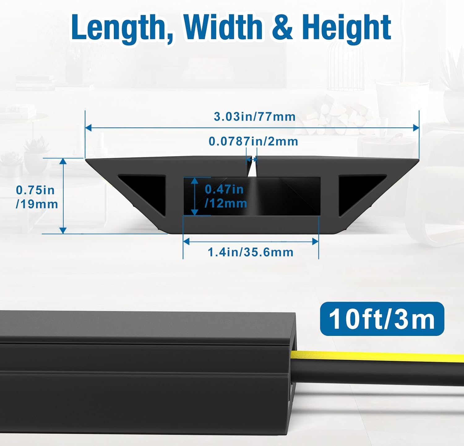 - Cable Protector Floor-- 10 feet long, 0.75" Height, 3.03" External width. Extension cord floor cover is long and wide to cover the cables, wires or cords well. Please check the size of your cables or cords first before placing an order