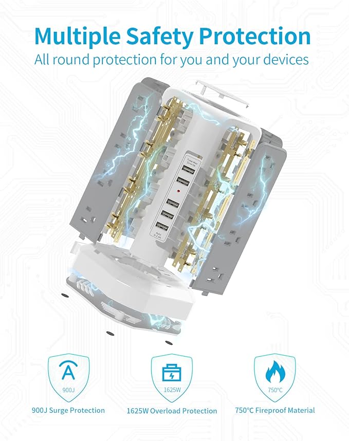 - 【Tower Space Saving Design】With a tower design, this multi outlet tower can save space on the ground by making use of vertical space, making it a great charging station.