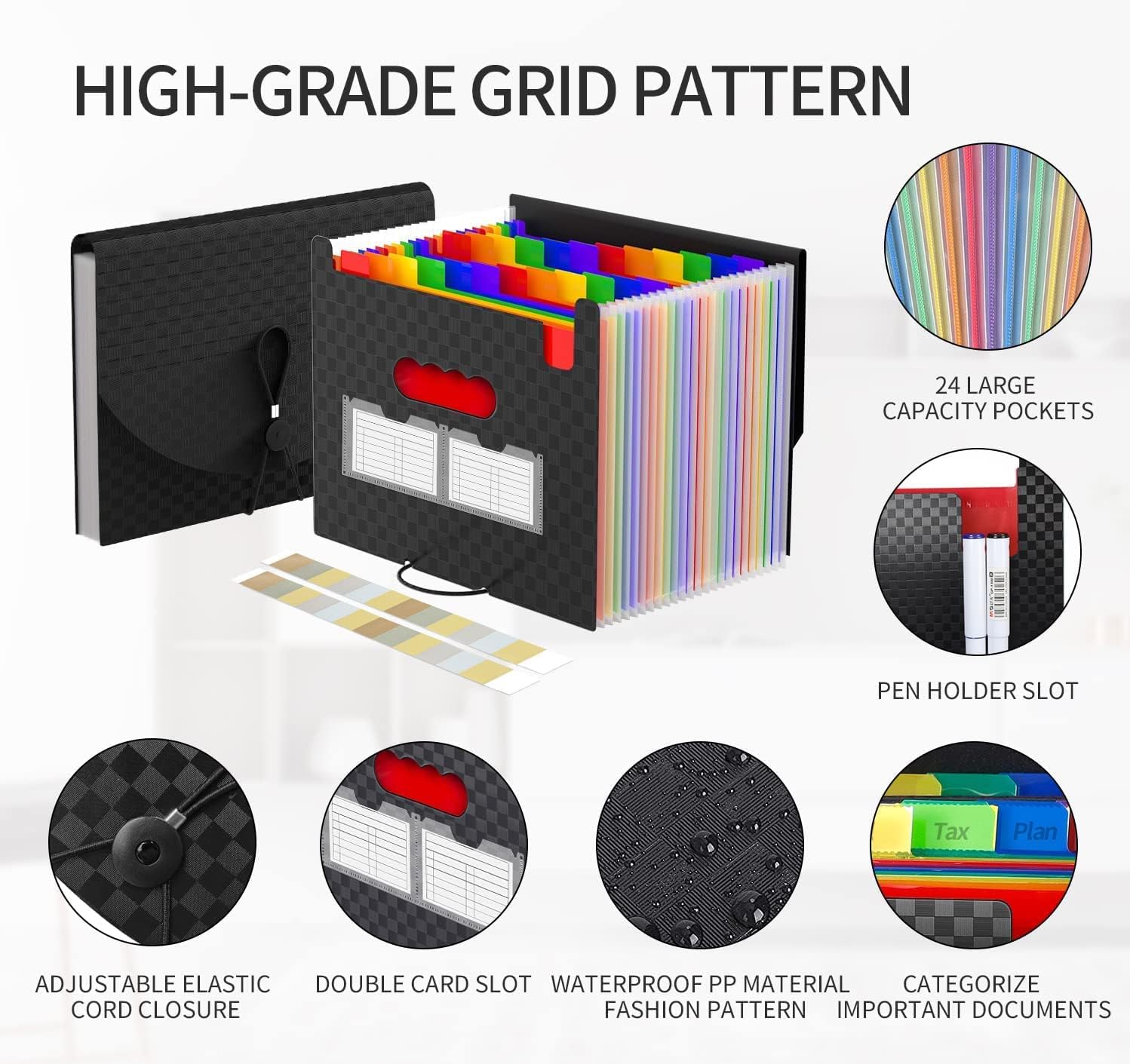 25 Pockets Accordion File Organizer Expanding File Folders,Expandable Document Organizer Plastic Accordian Filing Folder,A4/Letter Size Paper,Portable File Box,2 Tabs, Upgraded Grid Pattern