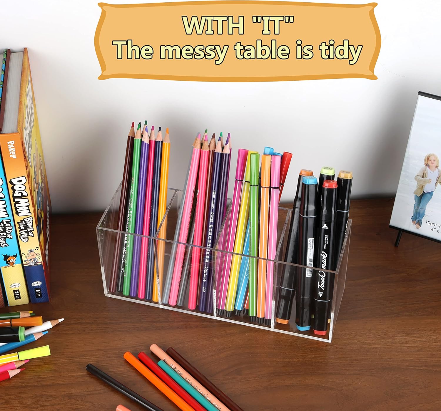 Clear Acrylic Pen Holder Handmade, 4 Slot Pencil Organizer Countertop, Pencil Stationery Organizer for Office Accessory, Makeup Cosmetic Brushes Storage, Clear Vanity Organizer for Bathroom (Clear)