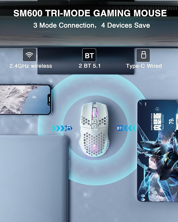 - 3 Mode Connection.SM600 wireless gaming mouse adopts tri-mode connection,2.4G wireless /2 BT5.1/Type-C Wired connection.Users can save 4 devices same time,support PC, laptop, tablet, mobile phone, etc. Switch convenientand connection quick!