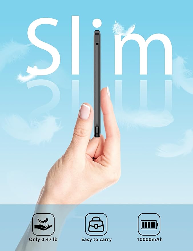 - High Capacity: Contains 10000mAh of power. Enough to provide over 2 entire replacement charge for iPhone 16, for iPhone 15 and Samsung Galaxy S24. 10000mAh can meet your daily electricity demand. And its body is slim, 5.59*2.75*0.57inch like a little phone that you can carry it in your handbag. It will be your most important partner daily. And when you are traveling or on a business trip that will be helpful