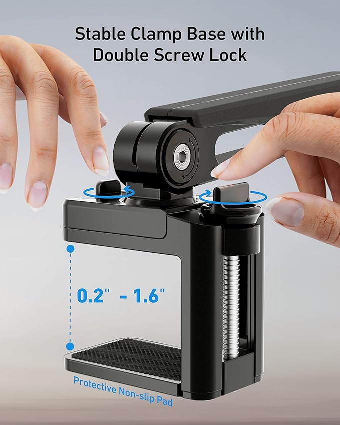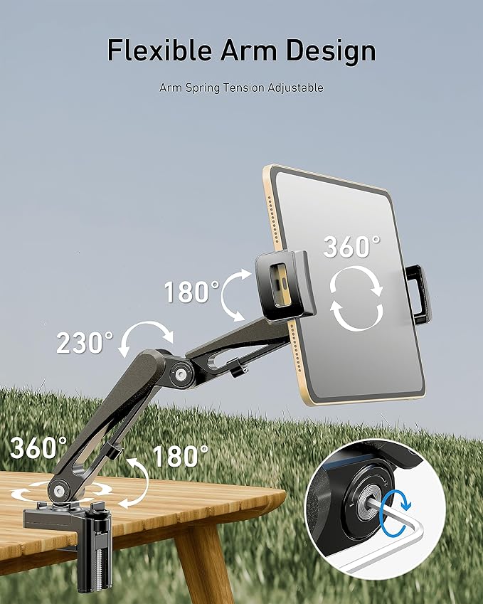 - 【Sturdy and Secure】: This iPad Stand features a strong clamp mount and durable materials for safe and stable device support. The reinforced base fits the countertop/headboard thickness between 0.2" to 1.6" (5 - 40 mm)