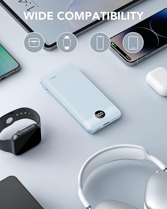 - [Wide Compatibility] Using the built-in charging cables to charge, the portable battery charger is compatible with iPhone, Android devices, and USB-C most mobile phones and smart devices etc. This battery pack can meet most of the charging needs of daily life.