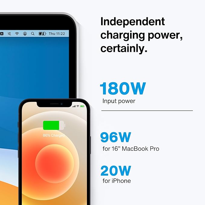 - 【Full Speed Charging】This dock features a 180W power adapter, enabling it to efficiently charge laptops up to 96W and PD USB-C devices up to 18W