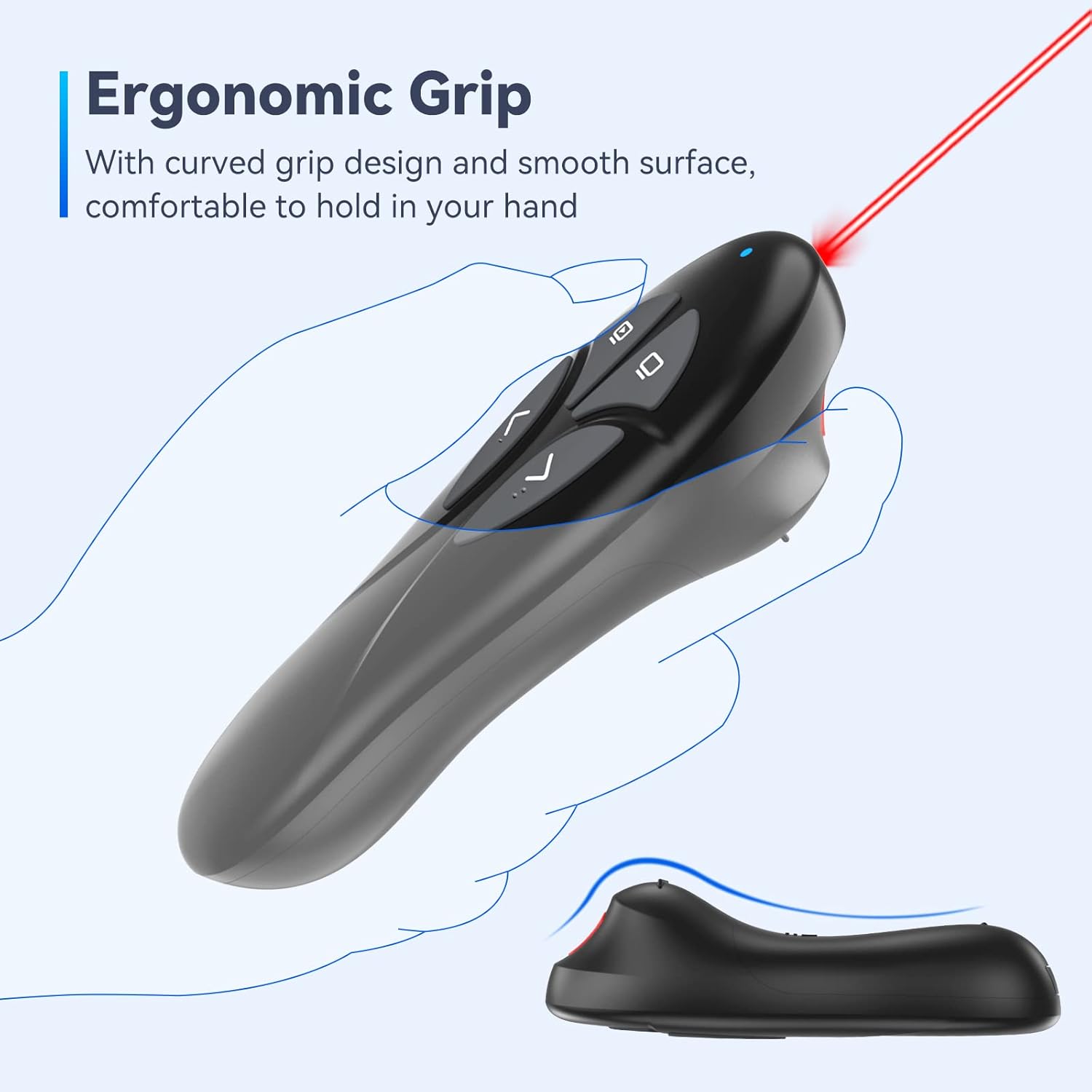 - Laser Pointer for Presentations: The presentation clicker is equipped with a red laser pointer, which is effective up to 656 feet, making it easy for you to highlight key points or details in your presentation.