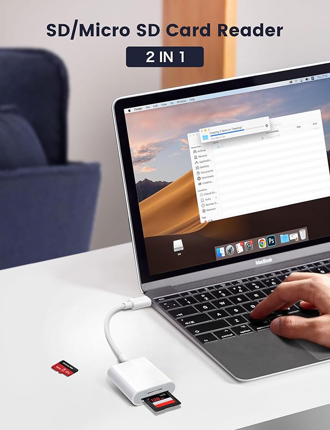 - 【Plug and Play】The SD card reader is designed with a built-in USBC Cord that does not block your other ports. Plug and play, no drivers required for iPad/Macbook/iMac/Windows. No additional power is required.