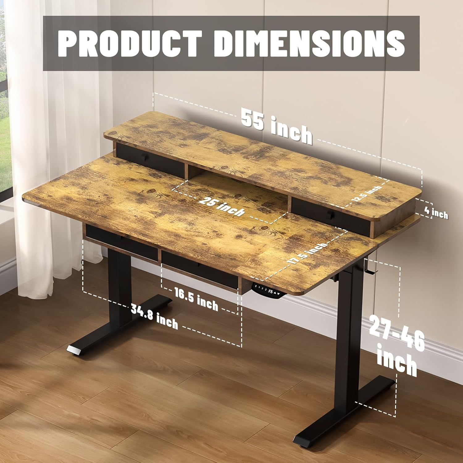 - 💡HEIGHT ADJUSTABLE: Electric lift system supports desktop lift range 27~46 Inches, Keypad Controller provides 3 memory Preset buttons. DC motor can hold up to 176 lbs