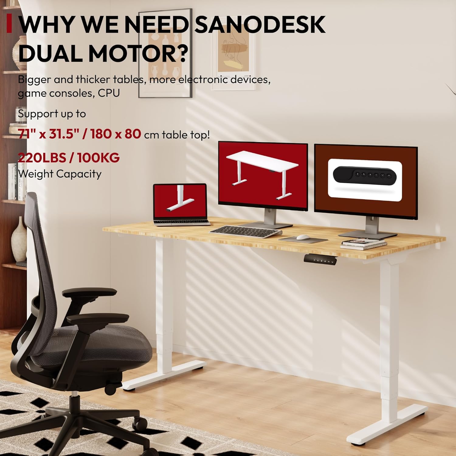- Dual Motor Design for Electric Standing Desk:The dual motor design ensures a seamlessly smooth and stable height adjustment.Supports an impressive weight capacity of up to 220lbs.Elevate and lower the electric standing desk with confidence, even in the quietest room.
