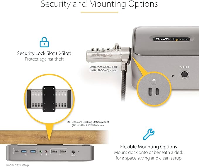 - CONNECTIVITY: The dock features a variety of ports for device connectivity; 2x USB 2.0 Type-A HID, 2x USB-A (10Gbps), USB-C (10Gbps), 2x DisplayPort, 2x USB-C host ports, Gigabit Ethernet, 3.5mm stereo audio, 3.5mm mic, 2x K-Slots (Standard/Nano)
