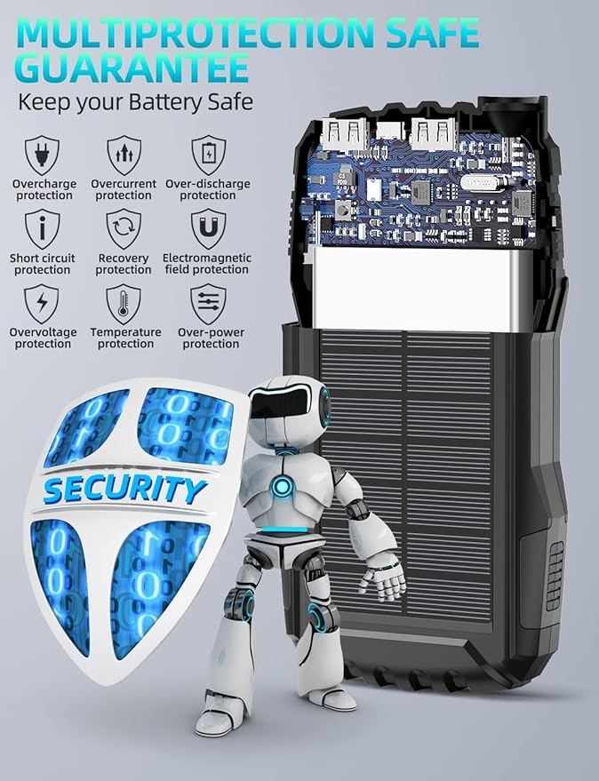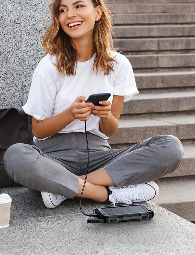 - Solar power bank portable charger uses strong professional ABS material, Chemical resistant, heat-resistant, and has super surface hardness, high elasticity and toughness. IP67 waterproof,drop-proof and dust-proof, so you no longer worry about damage caused by water/drop, the powerbank can work in extreme environments.
