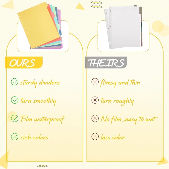 - Coated with a Plastic Film: our binder dividers and tabs are coated with a plastic film, which will reduce the scratches on them and make them not easy to bend; With this film, the water will not wet the paper, so you can use them with confidence