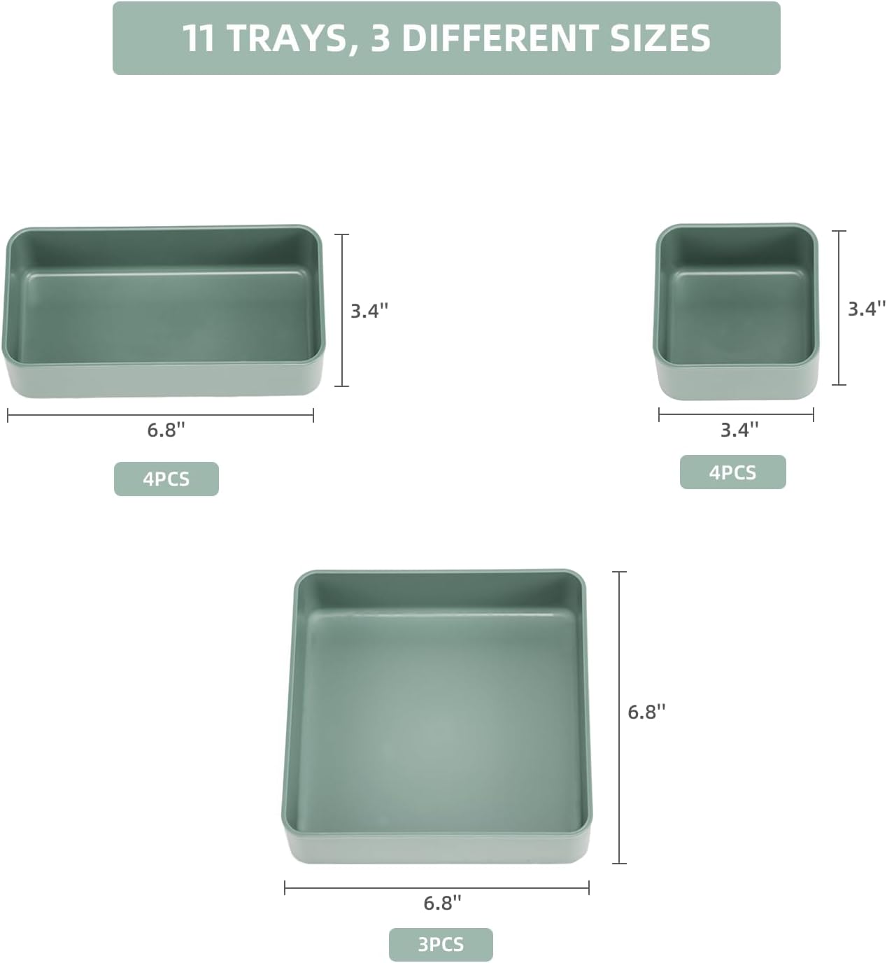- INCLUDES: 11 stackable trays each measuring 2 inches deep. Tray measures 6.8 x 6.8 inches (3 pack), 3.4 x 6.8 inches (4 pack), 3.4 x 3.4 inches (4 pack).
