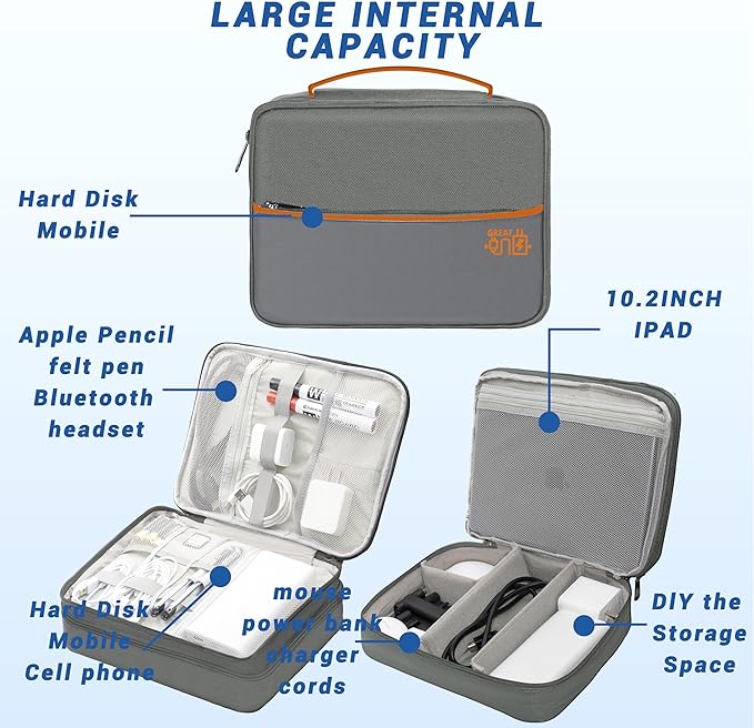 - Three Layer and DIY Combination:The first layer: the cable organizer has multiple elastic band compartments and mesh pockets to hold power bank,cell phone,USB cable cords,charger,flash drive and other electronic accessories.The second layer: Equipped with one large zipper mesh pocket for 10.2in iPad.The third layer: has 3 detachable padded partitions to DIY, free combination according to your own preferences.