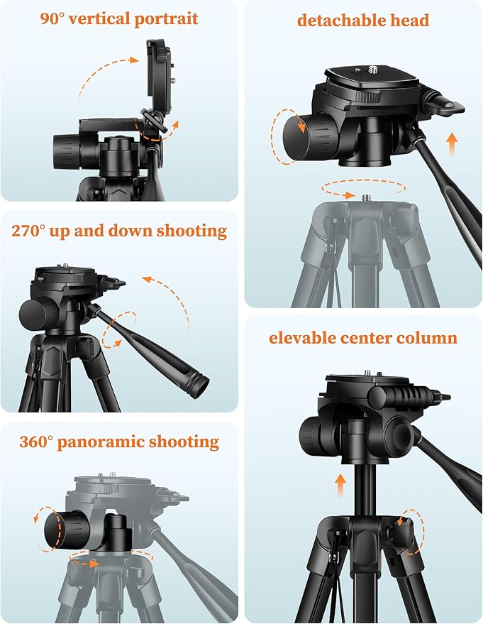 - 【Aluminum Tripod & 3-Way Pan Head】 JOILCAN compact tripod is made of high-quality aluminum alloy and non-slip rubber feet provide sturdy support to protect your equipment, and lightweight tripod weighs only 1.68 lbs, and the max load is 9.26 lbs. The 3-way pan head and dual built-in bubble view levels are ideal for precise framing, and the 360-degree swivel functions allow you to easily take superb panoramic shots or switch from portrait to landscape mode.