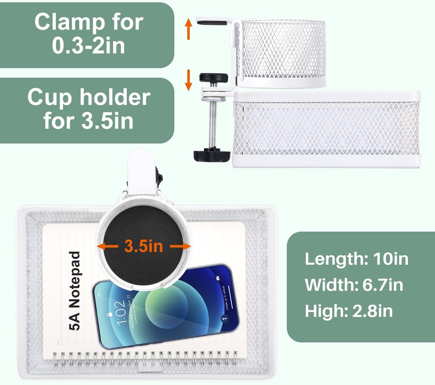 - [Integrated Appearance] This hanging desk storage comes with a cup holder, and both the drawer and cup holder are made of metal mesh, highlighting their perfect match and pure handmade manufacturing. The bottom of the cup holder is equipped with an anti-skid pad to prevent accidental slipping of your cup. The maximum diameter of the cup holder can accommodate cups or bottles with a diameter of up to 3.2 inches.
