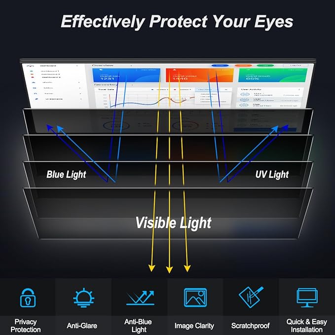 - 【Protect Your Eyes】- JEAPKA Computer Monitor Privacy Filter not only offers privacy but also protects your eyes. It filters out 96% of UV rays and reduces 65% of blue light, providing essential eye protection. The reversible privacy screen filter comes in a matte finish, which minimizes glare and softens harsh light, and a glossy finish, which offers enhanced privacy. Choose the one that suits your needs. Additionally, it also safeguards your screen from dust and scratches.