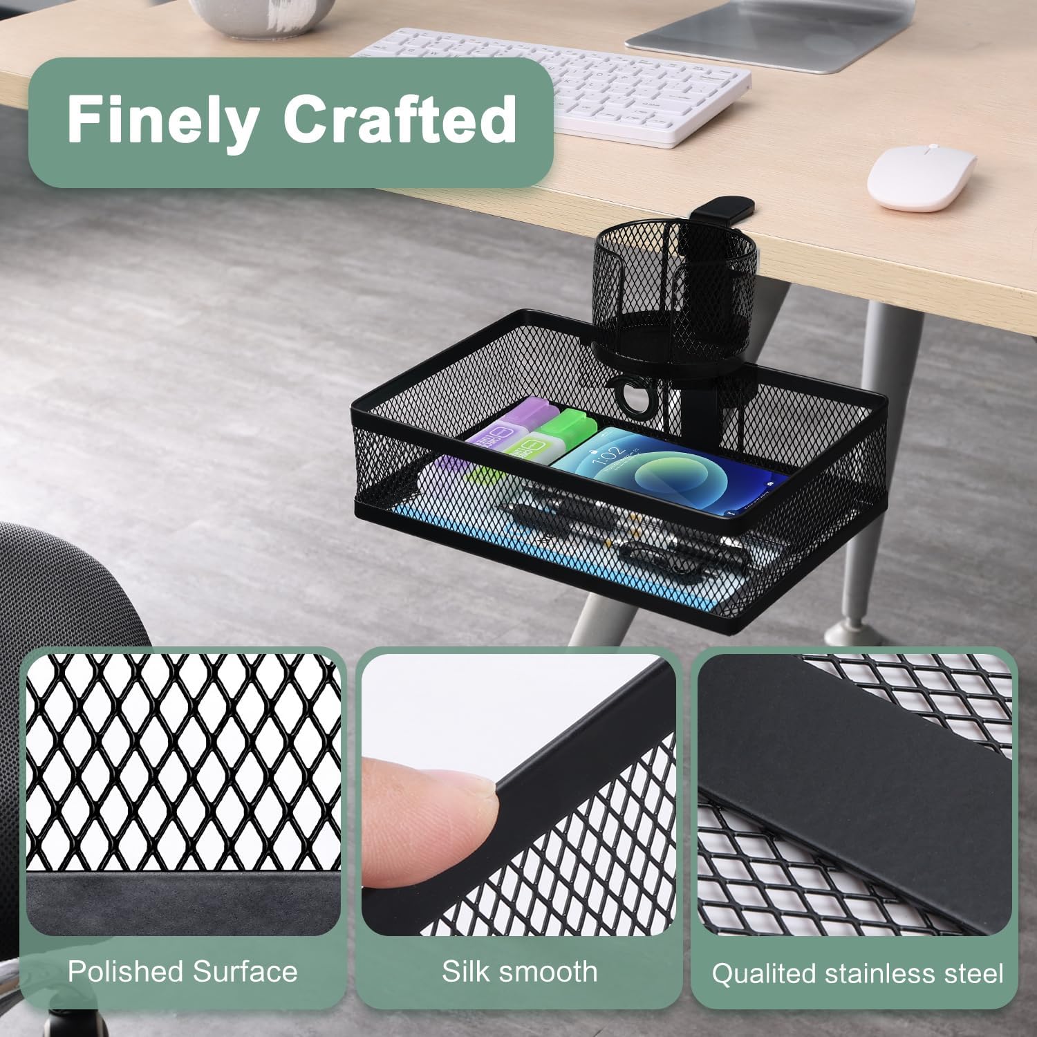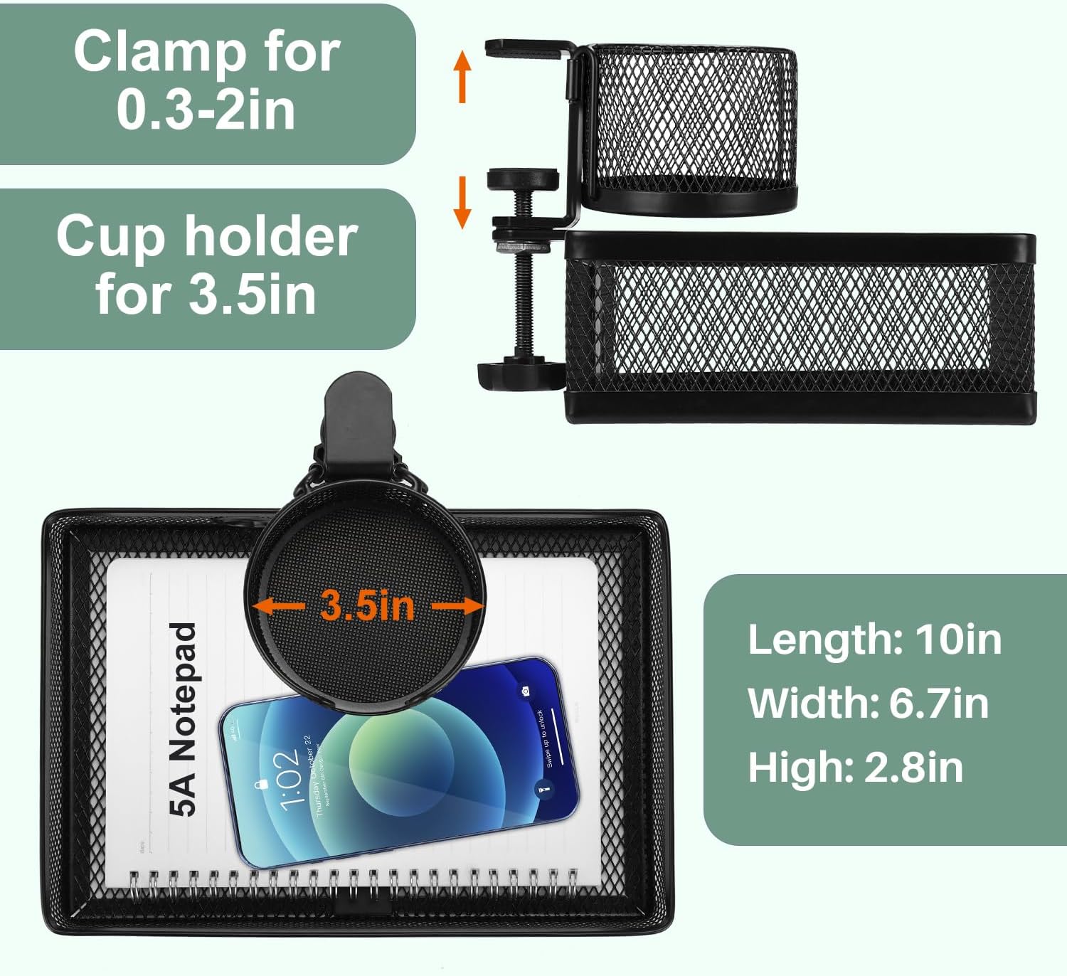 - [Integrated Appearance] This hanging desk storage comes with a cup holder, and both the drawer and cup holder are made of metal mesh, highlighting their perfect match and pure handmade manufacturing. The bottom of the cup holder is equipped with an anti-skid pad to prevent accidental slipping of your cup. The maximum diameter of the cup holder can accommodate cups or bottles with a diameter of up to 3.2 inches.