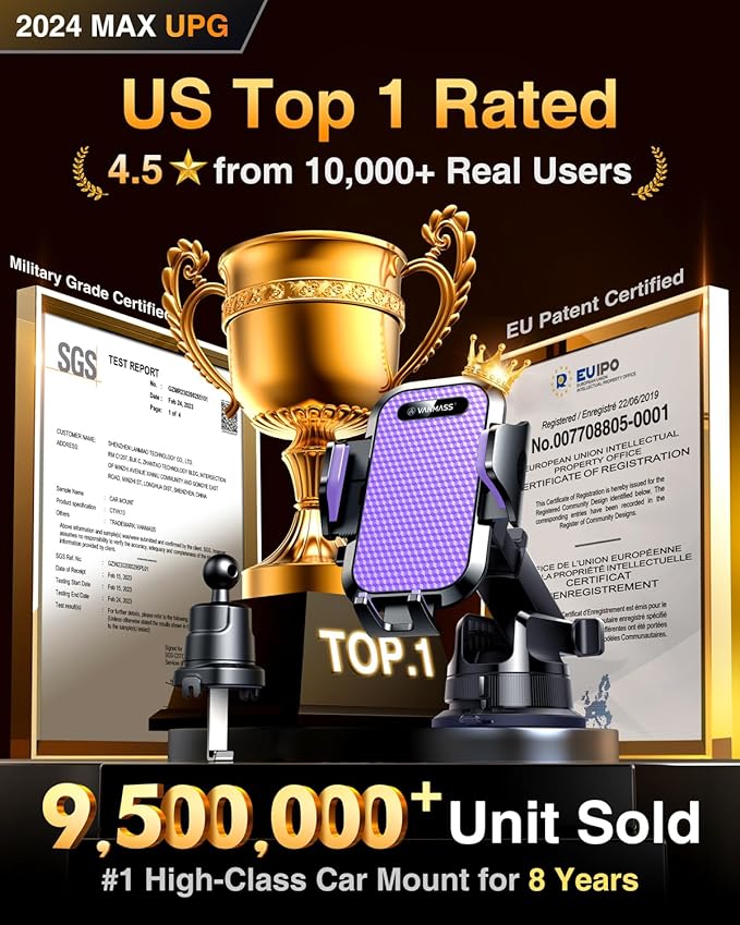 - 【True Military-Grade Certified, Upgraded Ultimate Car Mount】VANMASS, the leader in high-end car phone holder. Over the past 8 years, We have listened to the voices of millions of users, rigorously tested to MILITARY GRADE standards (stability, compatibility, flexibility, security, durability). Finally, we overcome all weaknesses to design the Ultimate Model that we are most satisfied with. This item obtained international military-grade shockproof certification No. GZMR220601855501