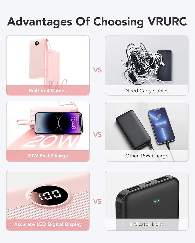 VRURC Portable Charger, 20000mAh Power Bank Fast Charging, Built-in Micro & USB C Three Cables, 4 Output 2 Input LED Display Charging Bank for iPhone, Samsung, Android etc-Pink (1 Pack)