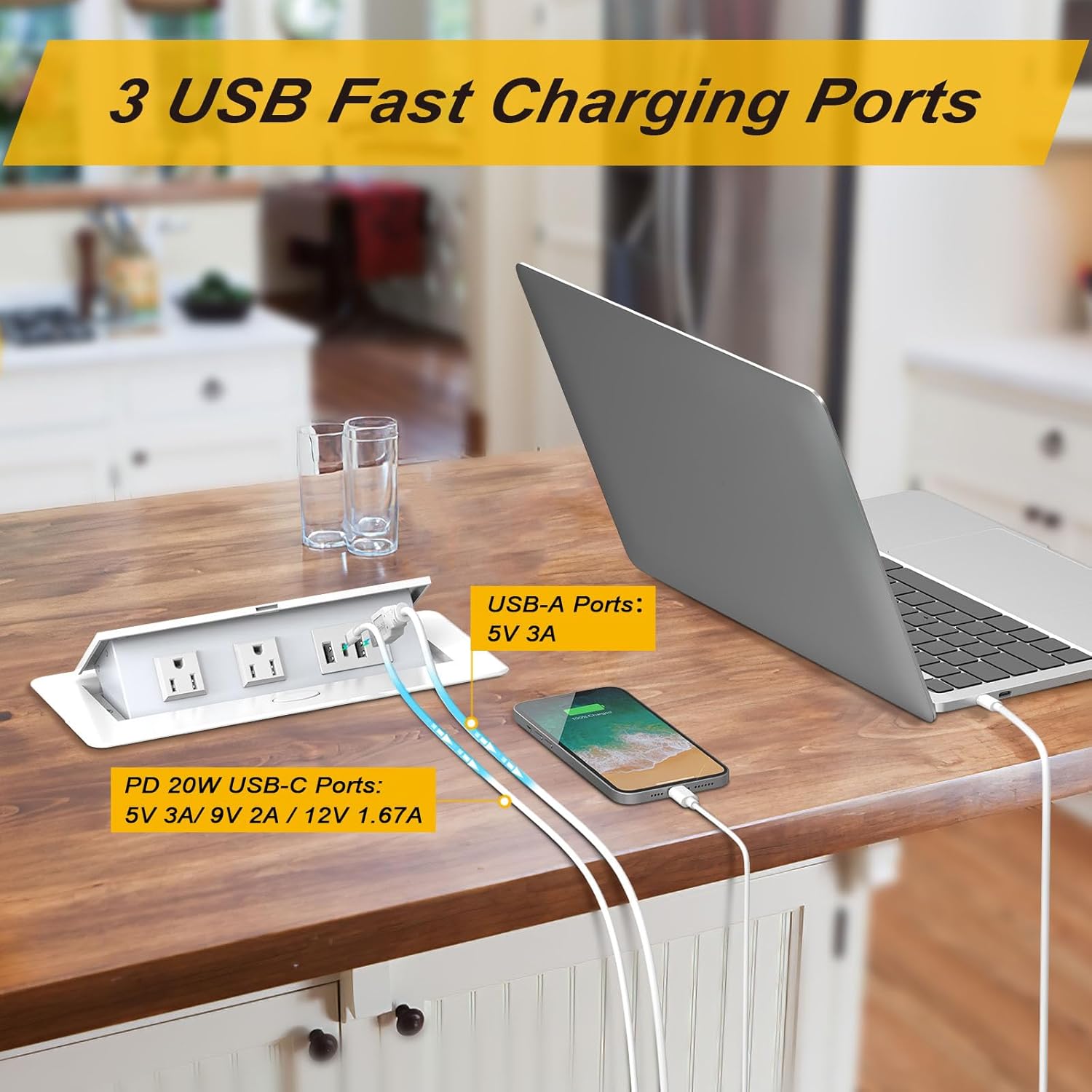 - 【 Pop Up Power Strip】: Pop up slowly at 45 degrees with damped spring structure, pops up when in use, hides in the box when not in use. This invisible power outlet connectivity box is essential for you.