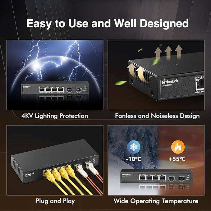 MokerLink 4 Port 2.5G Ethernet Switch with 2 Port 10G SFP+ Slot, 4 x 2.5G Base-T Ports Compatible with 10/100/1000Mbps, Metal Unmanaged Fanless Small Network Switch